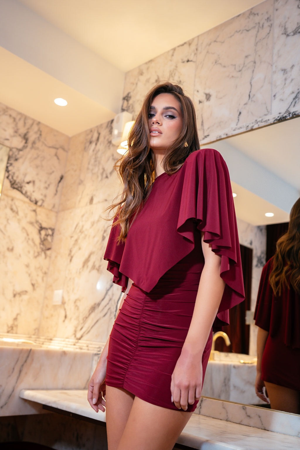 CAPE MINI DRESSS WITH REMOVABLE SHOULDER PADS - PLUM