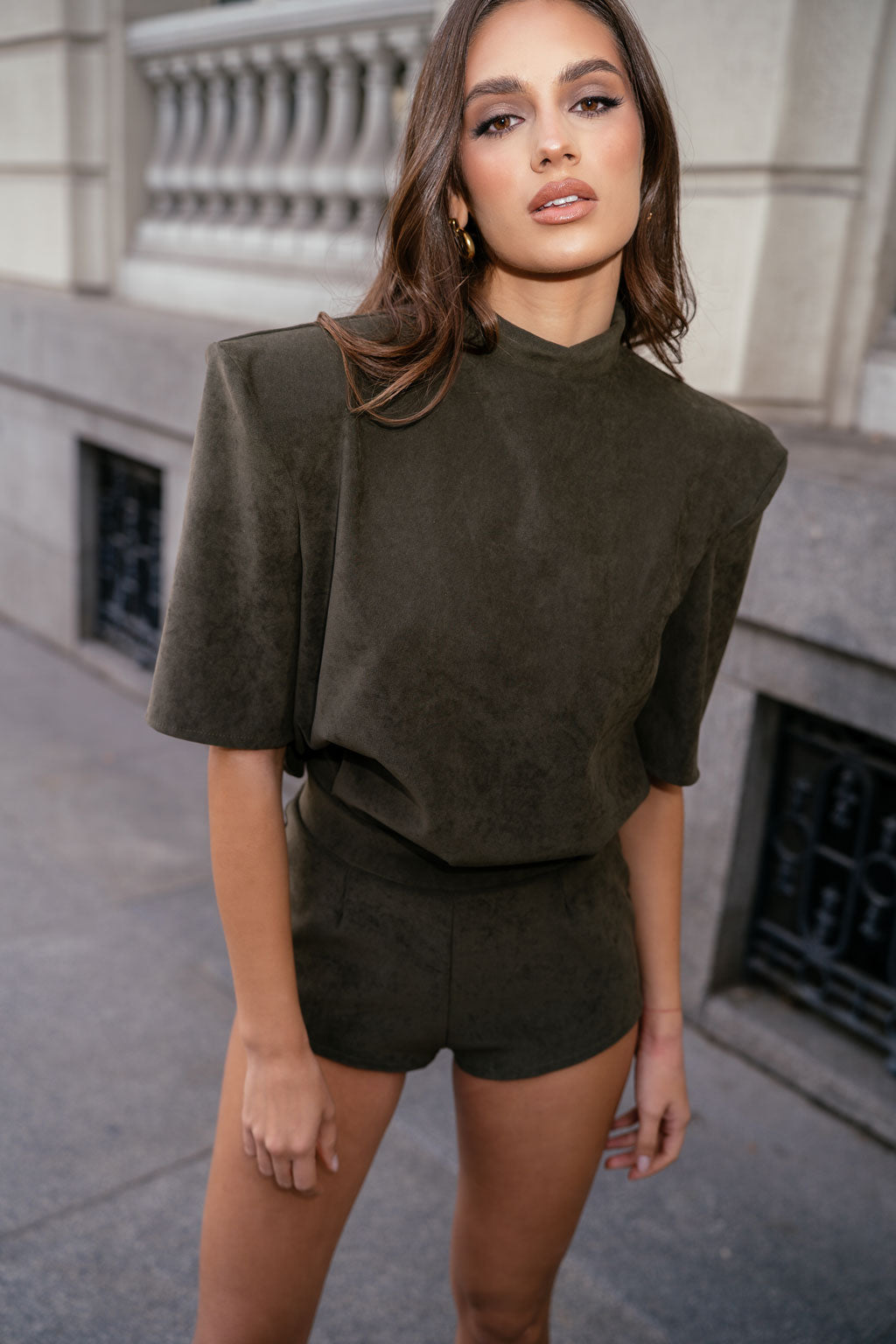 SUEDE PADDED SHOULDER PLAYSUIT - KHAKI